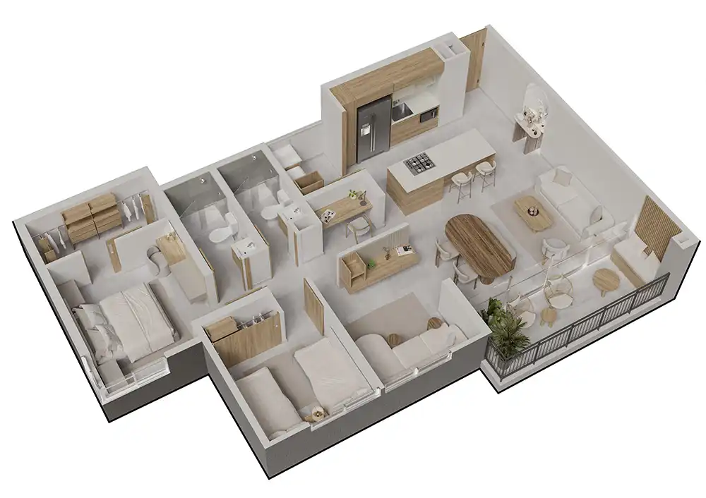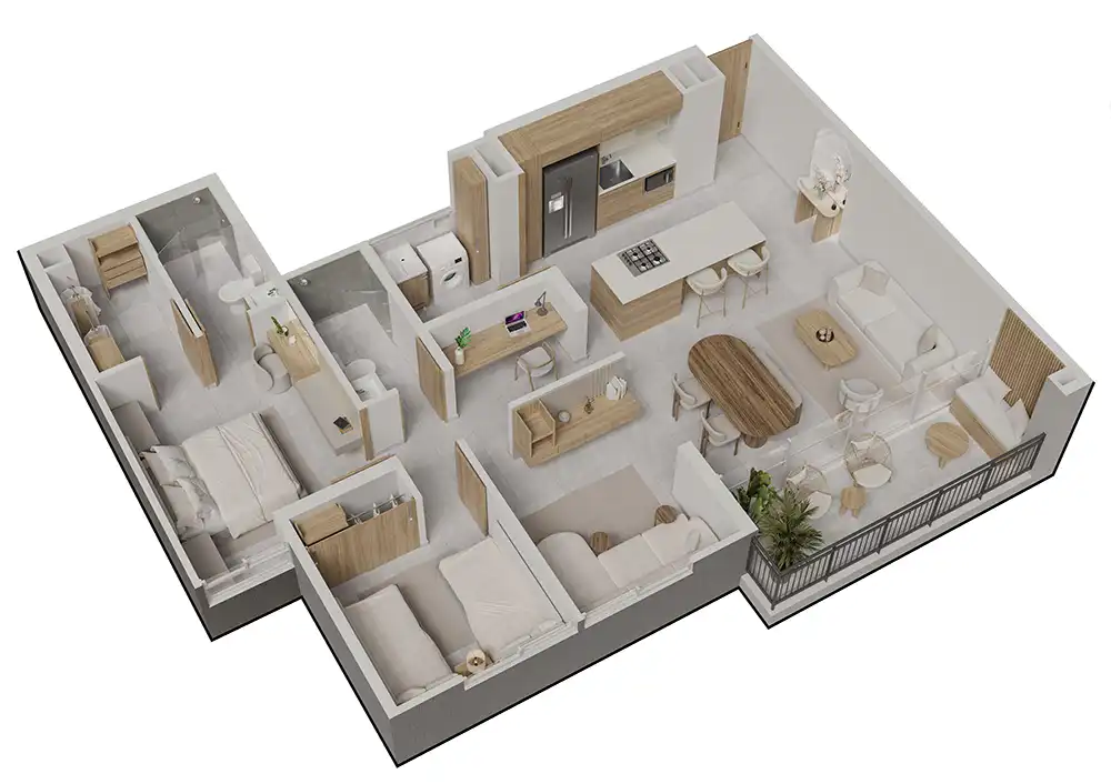 El diseño propuesto y los acabados presentes en este modelo pueden estar sujetos a modificaciones y cambios durante el proceso y desarrollo arquitectónico y de construcción. La ubicación y vista de los inmuebles que conforman el proyecto, dependerán del diseño aprobado, que podrá diferir de lo plasmado en este sitio web.